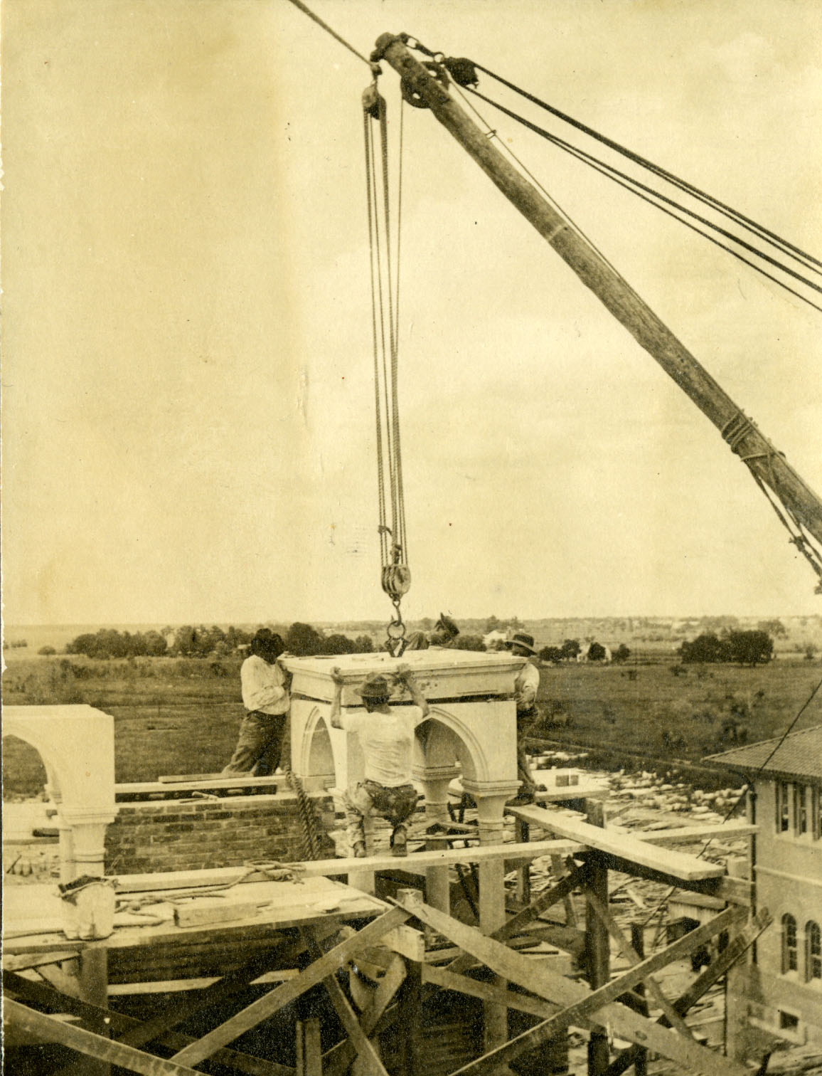 I was struck again by the grace and beauty of the Physics Building and I stood in front of it for a long time. This is my favorite building at Rice and my love for it deepens steadily as I understand it better. Not long ago I came across these two images of men doing detail work on the exterior of the building. These pictures are especially interesting to me because they are orphans of a sort–I don’t know where they came from. They aren’t part of the William Ward Watkin collection and are only identified as “Physics construction, unknown source.” I think they too are lovely.