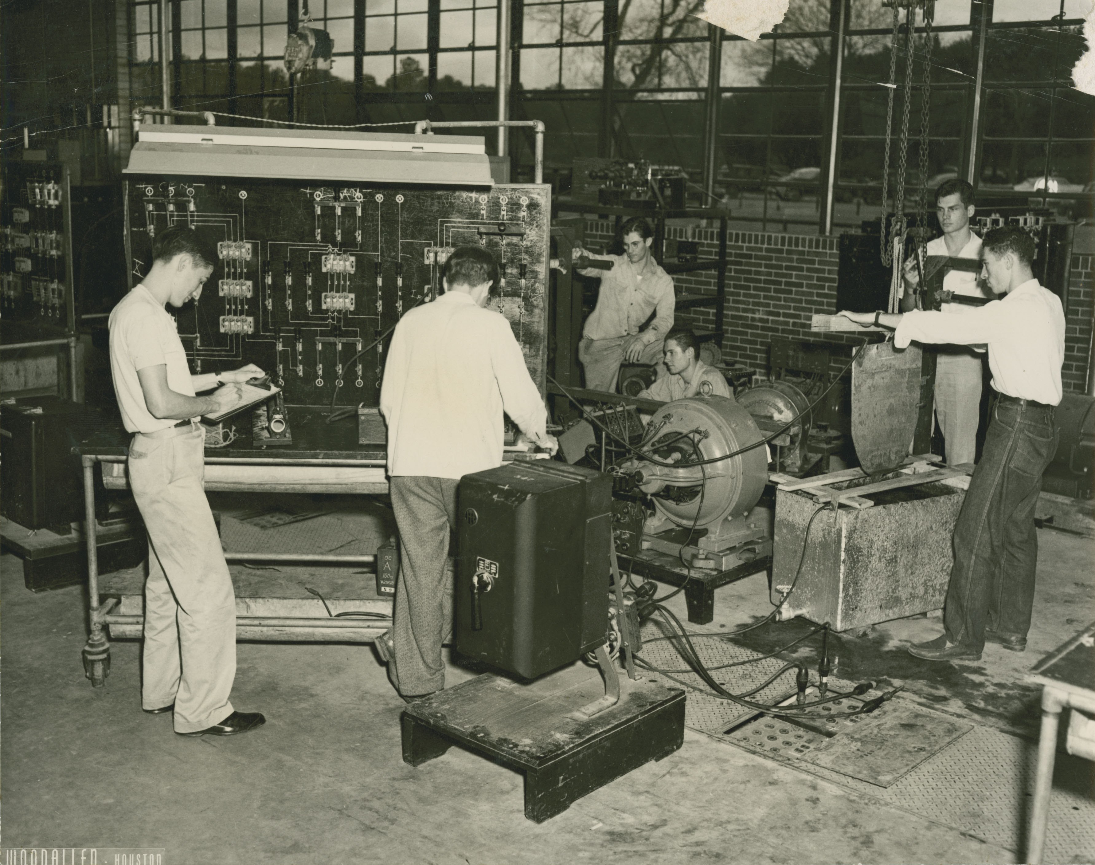 “The first picture appears to have been taken during a lab session in a course we called Power in the early 60s. It was taught by Mr. Waters and I believe it ended when he did. It dealt with “Rotating Machinery”, i.e., Motors and Generators (large ones!). The box-looking thing with the blade suspended above it was a “Water Box” which was used to present a load to the unit under test. In my day, these were outside those windows of the Mech Lab Building. You can see one cable connected to the box, the other to the blade.”