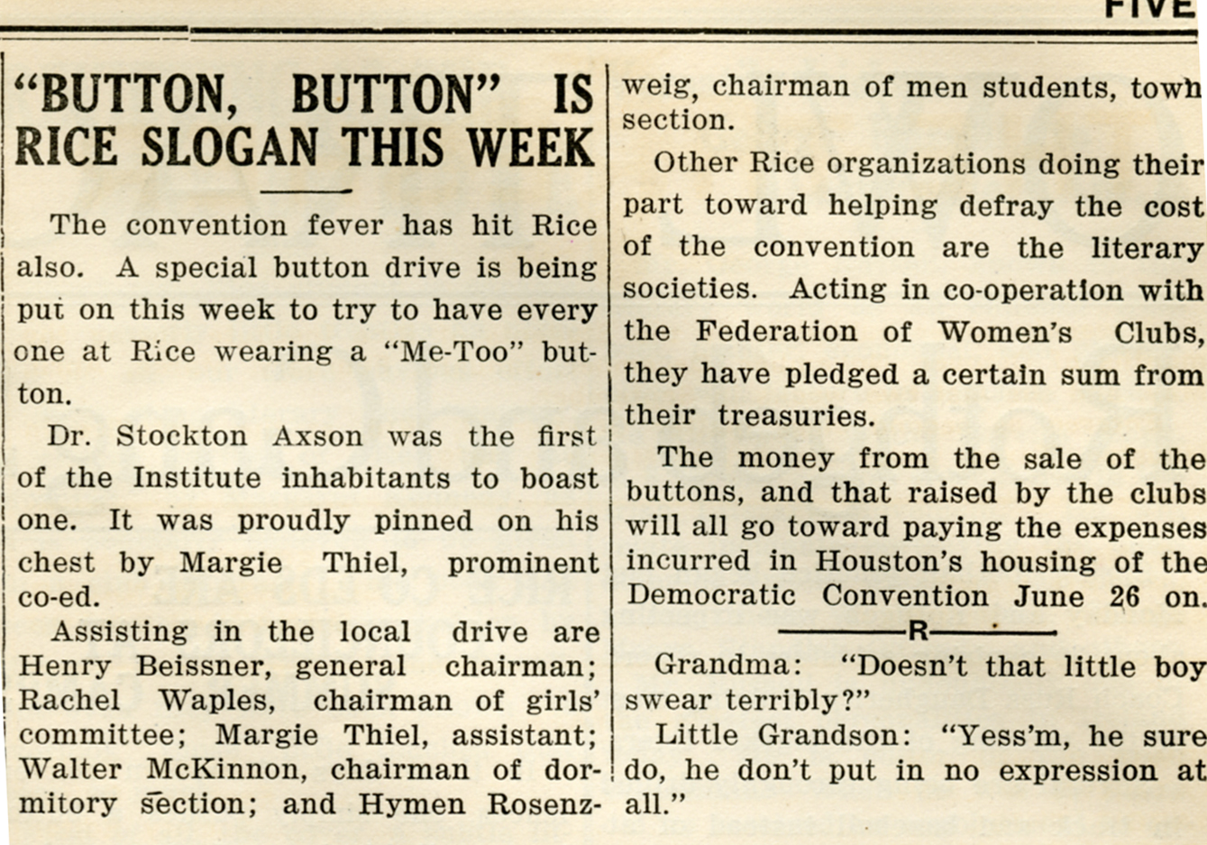 I scanned this Thresher article from March, 1928 for a couple of reasons. First, the joke at the bottom made me laugh. This is a bit unusual, as old-time jokes are often completely mystifying. It’s not that they’re not funny, but that you don’t even know why they’re jokes. I was also interested in the all-out push to help fund a partisan political event. Much of this was motivated by local boosterism, but it’s also certain that the vast majority of people at Rice and in Houston were Democrats, still part of the fallout from the Civil War and Reconstruction.